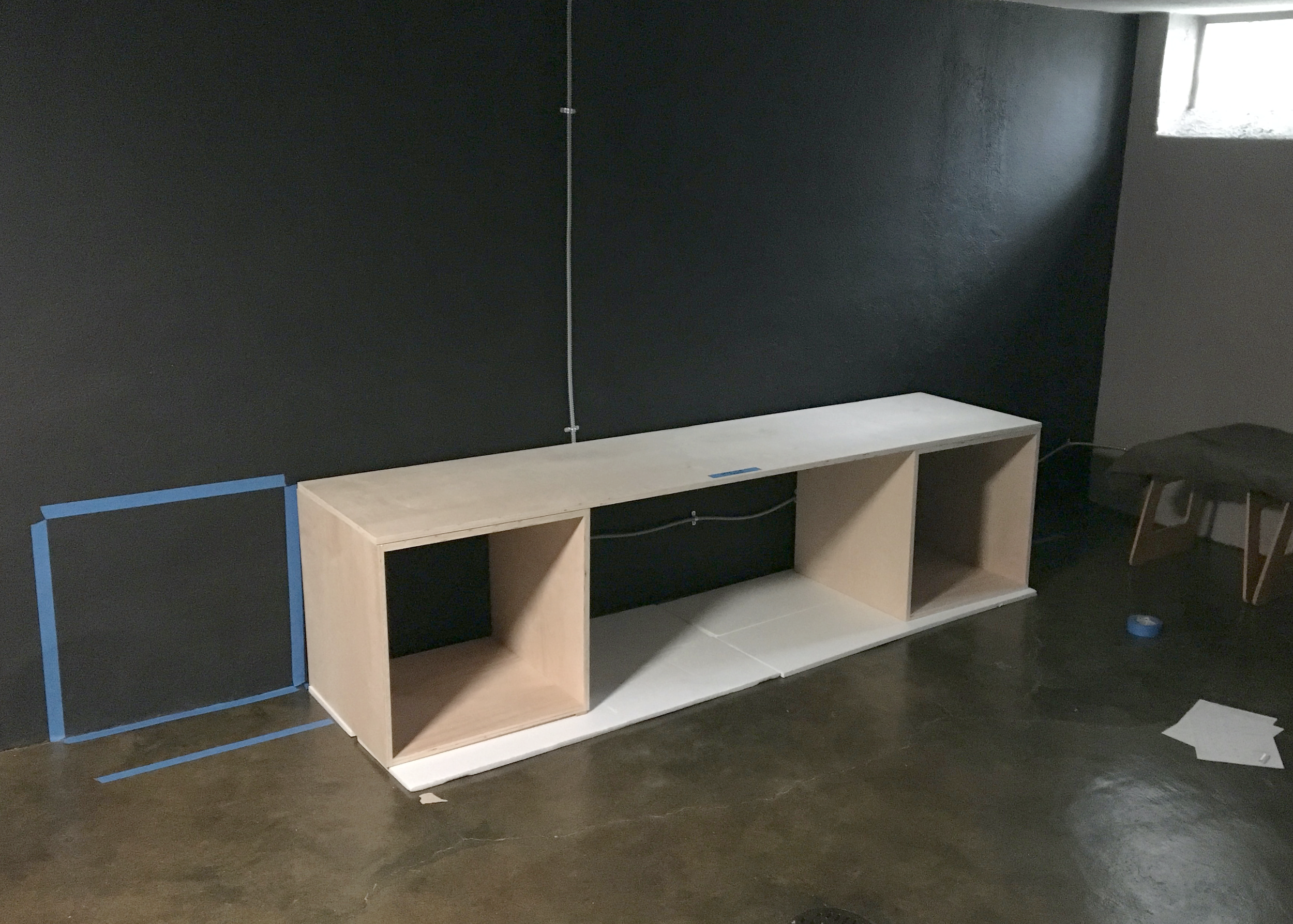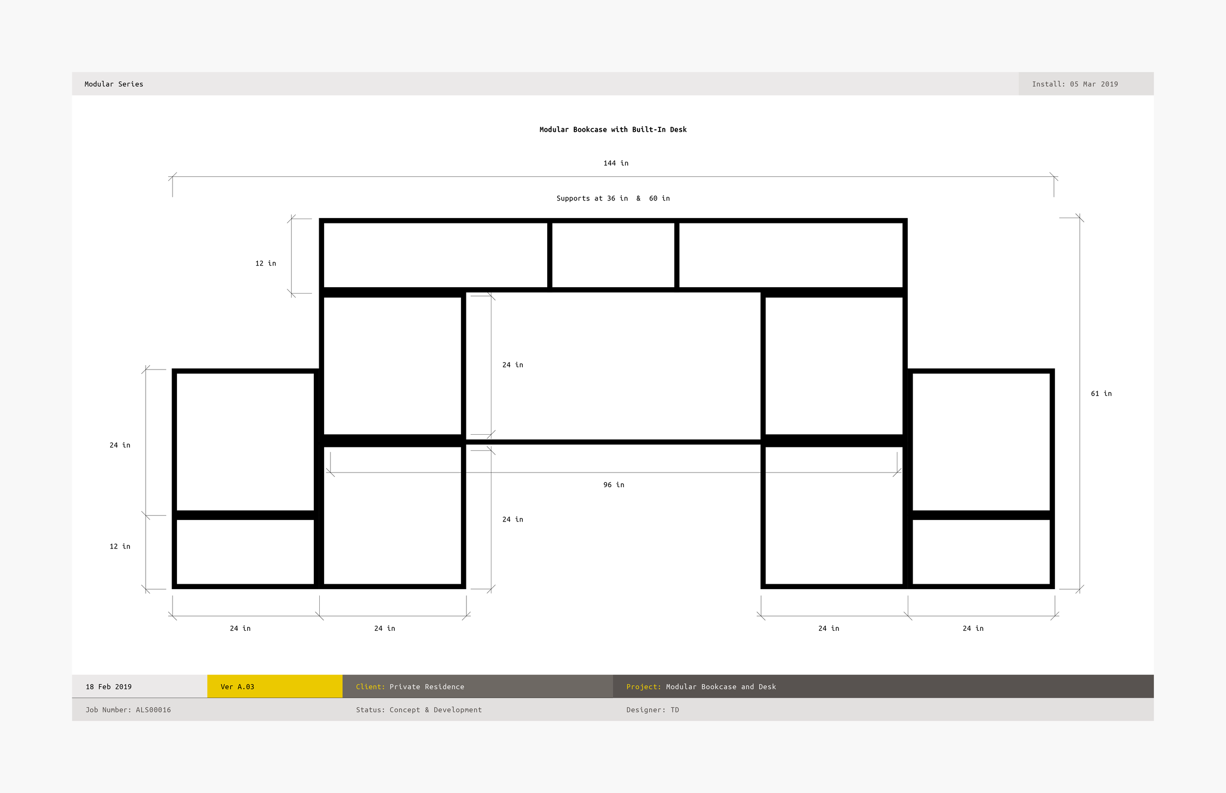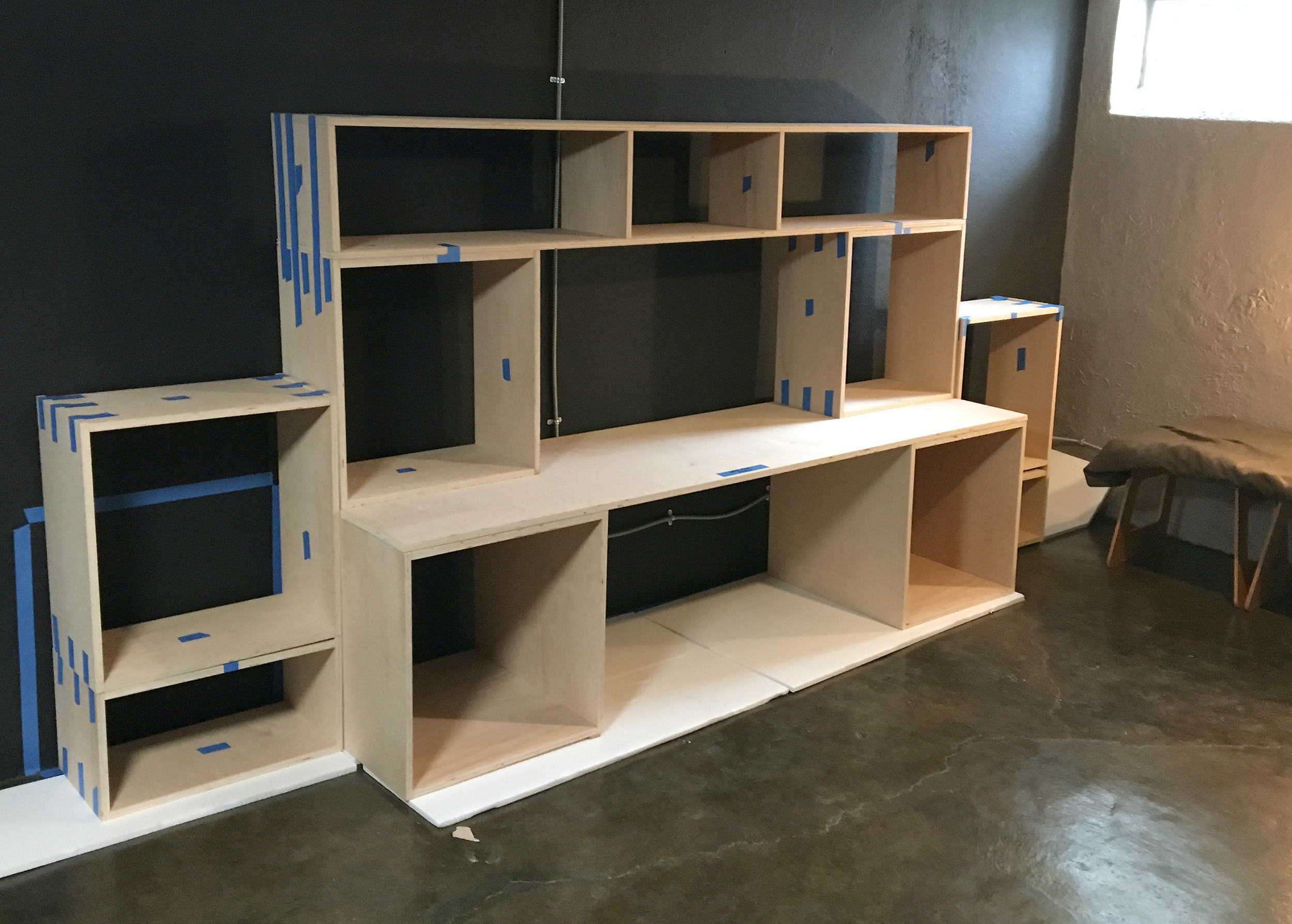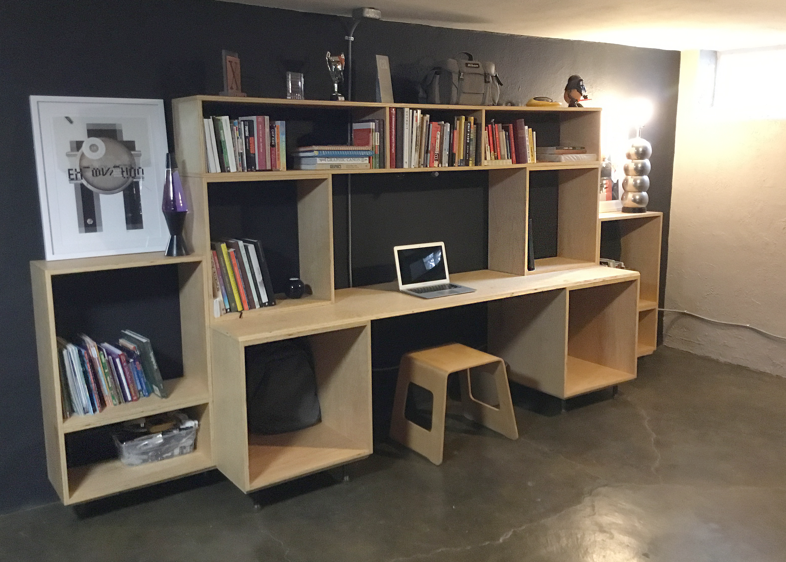This 12’ wide, 10-piece modular bookcase with a built-in desk was constructed from 3/4” birch plywood and adjustable pipe legs. It uses a locking dowel system to lock the pieces in place. See the following images for tech drawing and installation process.