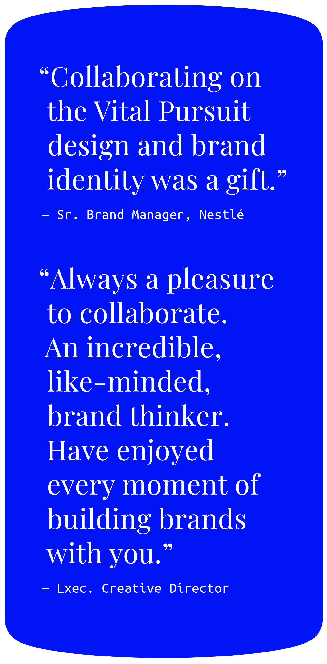 As a partner and advisor to national and global marketing brand teams, I would lead complex brand identity, brand guidelines and packaging redesigns; art direct product photography and strengthen creative briefs.